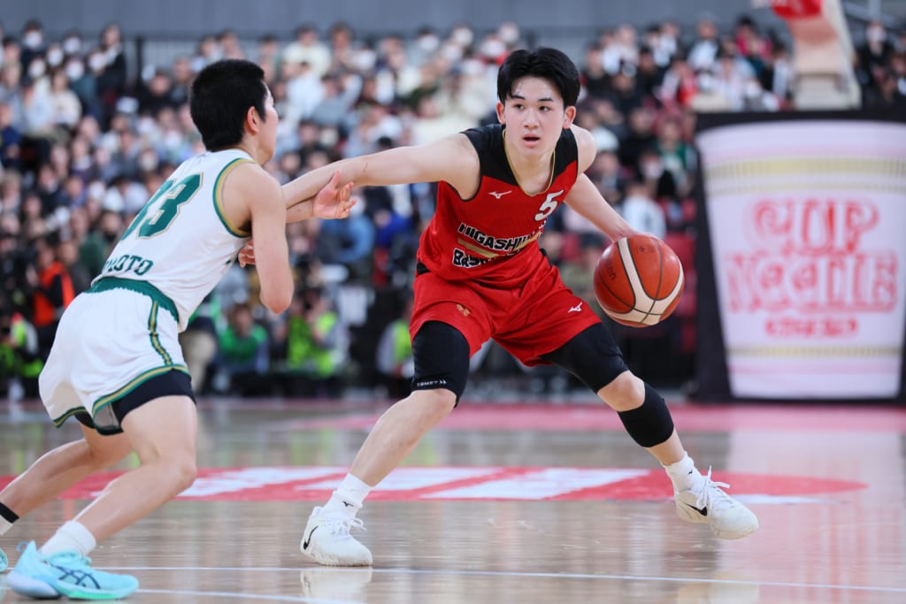 一方、5 大会ぶりの決勝進出を決めた東山もまた、準決勝は苦しい試合となりました。第 1 クォーターを 20-9 と最高の形で終えたものの、第 2 クォーターでは福岡第一 (福岡①) の怒涛の攻めに押されて 1 点差に詰められて前半を終えます。その後もリードしては追い上げられと、終盤まで勝負の行方はもつれましたが、最後は #5 佐藤凪選手、#10 鈴木勇功選手らで畳み掛けて勝負あり。粘る福岡第一を振り切って決勝進出を決めました。