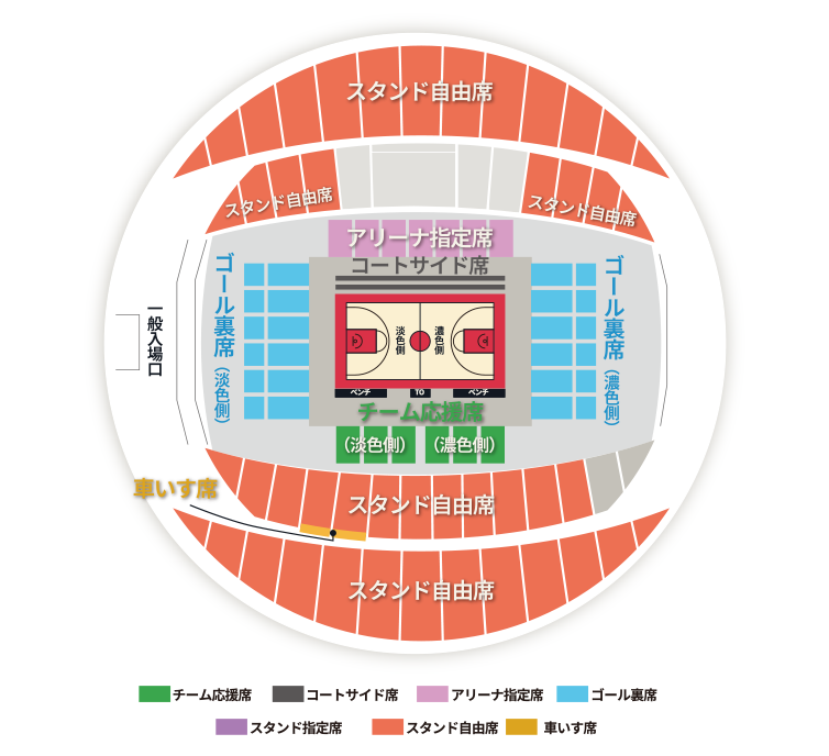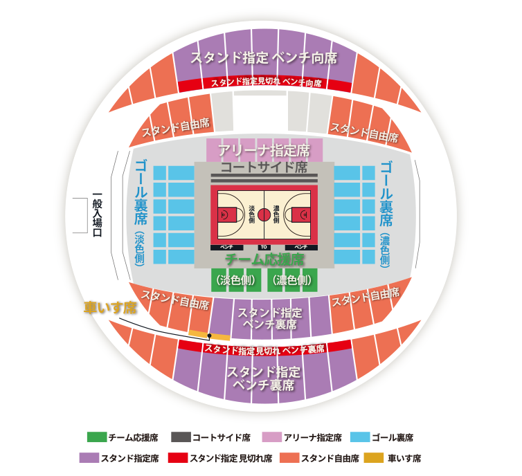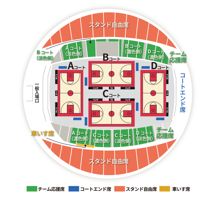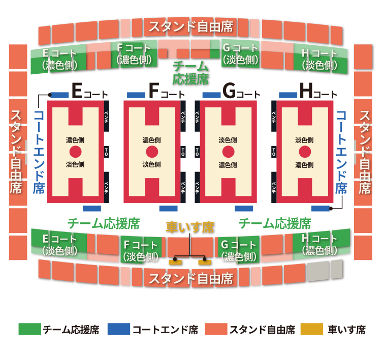 - コートエンド席、コートサイド席をご購入のお客様は、該当試合以外をスタンド自由席にて観戦いただけます。